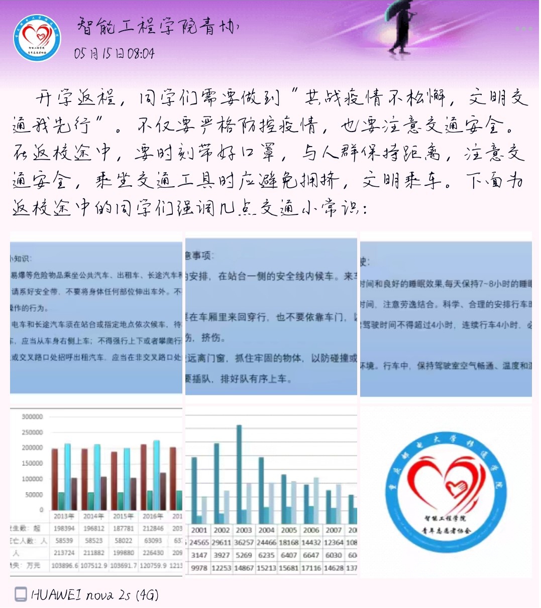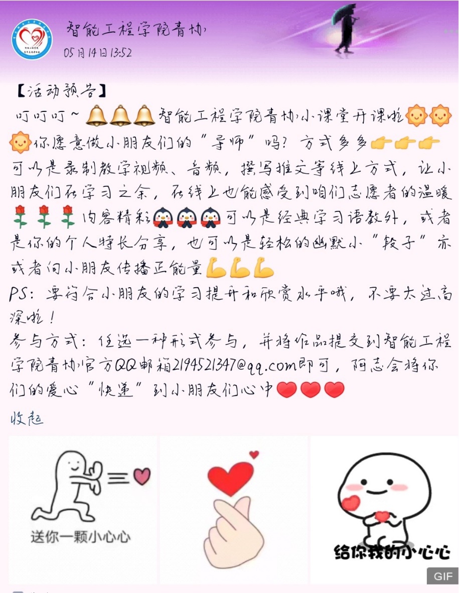 不管是疫情期间,还是复工复产,青年志愿者们永远是靓丽的风景线。面对即将返校的学生们,助力大家安全返校,智能工程学院青年志愿者协会开展“心中常亮红绿灯”青年交通知识安全普及,通过倡议的方式呼吁大家共战疫情不松懈,文明交通我先行;“爱的传递,有你参与”爱心作品征集活动为困难儿童送去暖心关怀。奉献、友爱、互助、进步,智能工程学院的青年志愿者们秉持着志愿精神一直在路上。