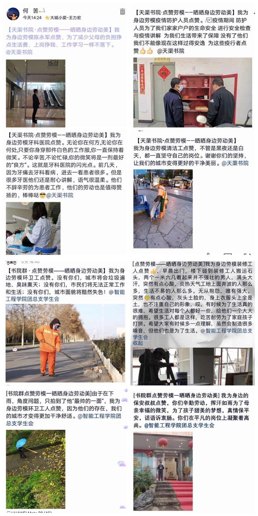 作为专业集中式书院,智能工程学院荷悦书院群一直为学生成长助力加油,从思想到技能,从意识引导到能力培养,夯实专业知识,做学生发展的加油站,致力于培养德智体美劳全面发展的新时代智工学子。5月,智能工程学院荷悦书院群利用时间结点,重在培养书院学子崇尚劳动、尊重劳动的习惯,同时呼吁学生常怀感恩之心,传承中华民族传统美德。分别开展“传承孝道——以爱之名、感恩有你”和行者公园·居家劳育——“点赞劳模、致敬劳动者”线上主题活动,手写祝福,传承孝道,记录劳模,弘扬社会正能量。