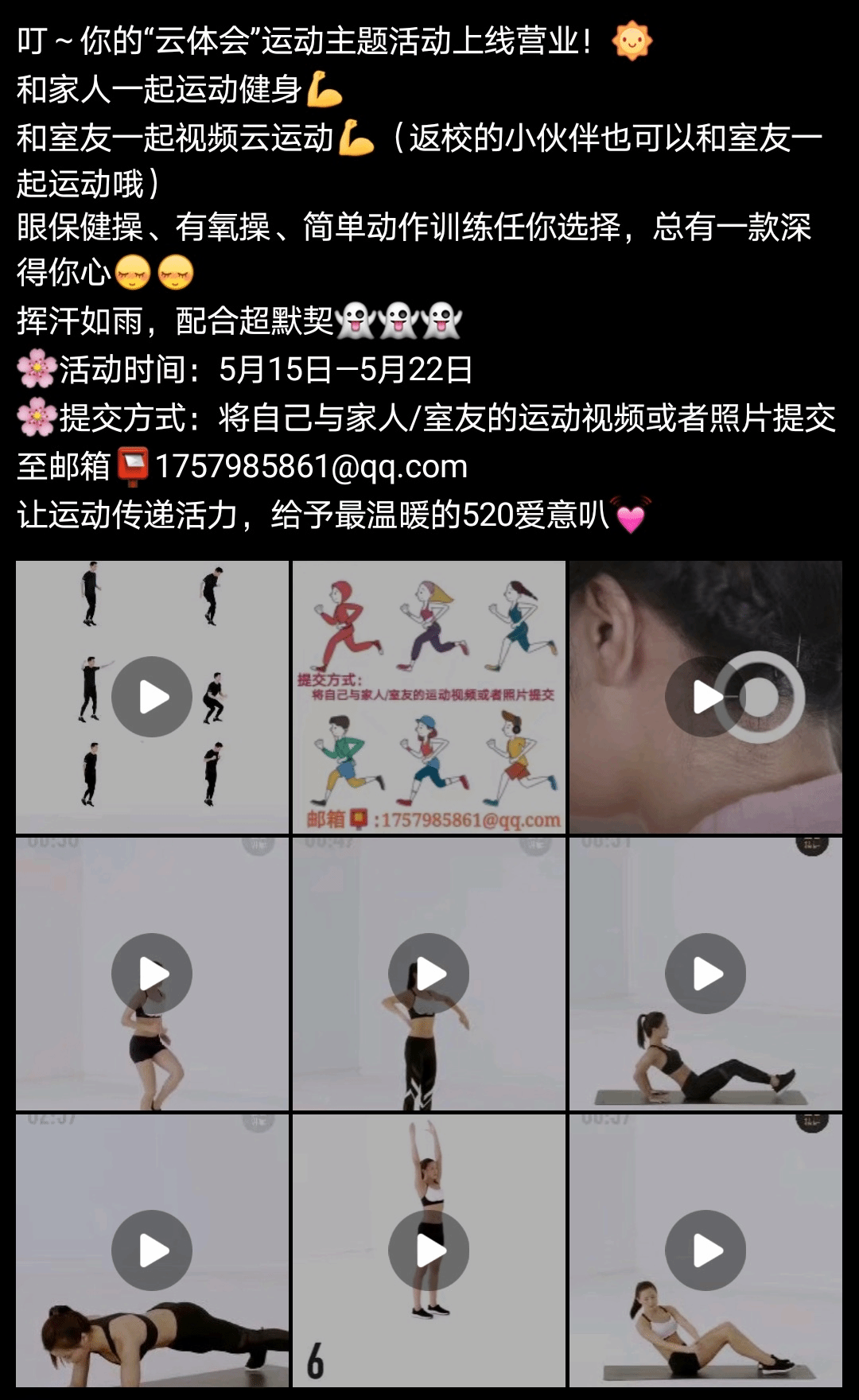 体育运动不仅在于强身,更在于养性。5月,为响应全民运动,健康中国的号召,智能工程学院体育协会联合竞技体育中心、教工之家工会委员会共同动员全校师生开展线上校园健身气功比赛,有利于疏通全身筋络,调整心态,为返校复学打下基础。“云体会”运动主题线上活动构建家人和学生云锻炼平台,传递运动活力,在亲密配合中给予温馨520爱意。
