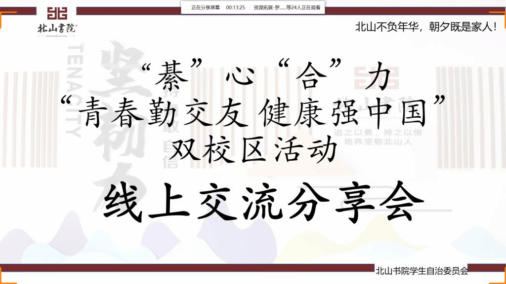 11月4日,共青团中央联合国家体育总局、全国学联面向全国大学生组织开展“青春爱运动 健康强中国”全民健身活动。为积极响应该活动精神,强化在校大学生身体素质,促进移通双校区学生的互动交流,北山书院依托常规活动体系“八个勤”推出专题活动,重点以“勤交友”、“勤阅读”、“勤运动”的方式号召双校区学子通过线上进行交友,“綦”心“合”力参与到运动打卡中,搭建跨校区朋辈圈层。