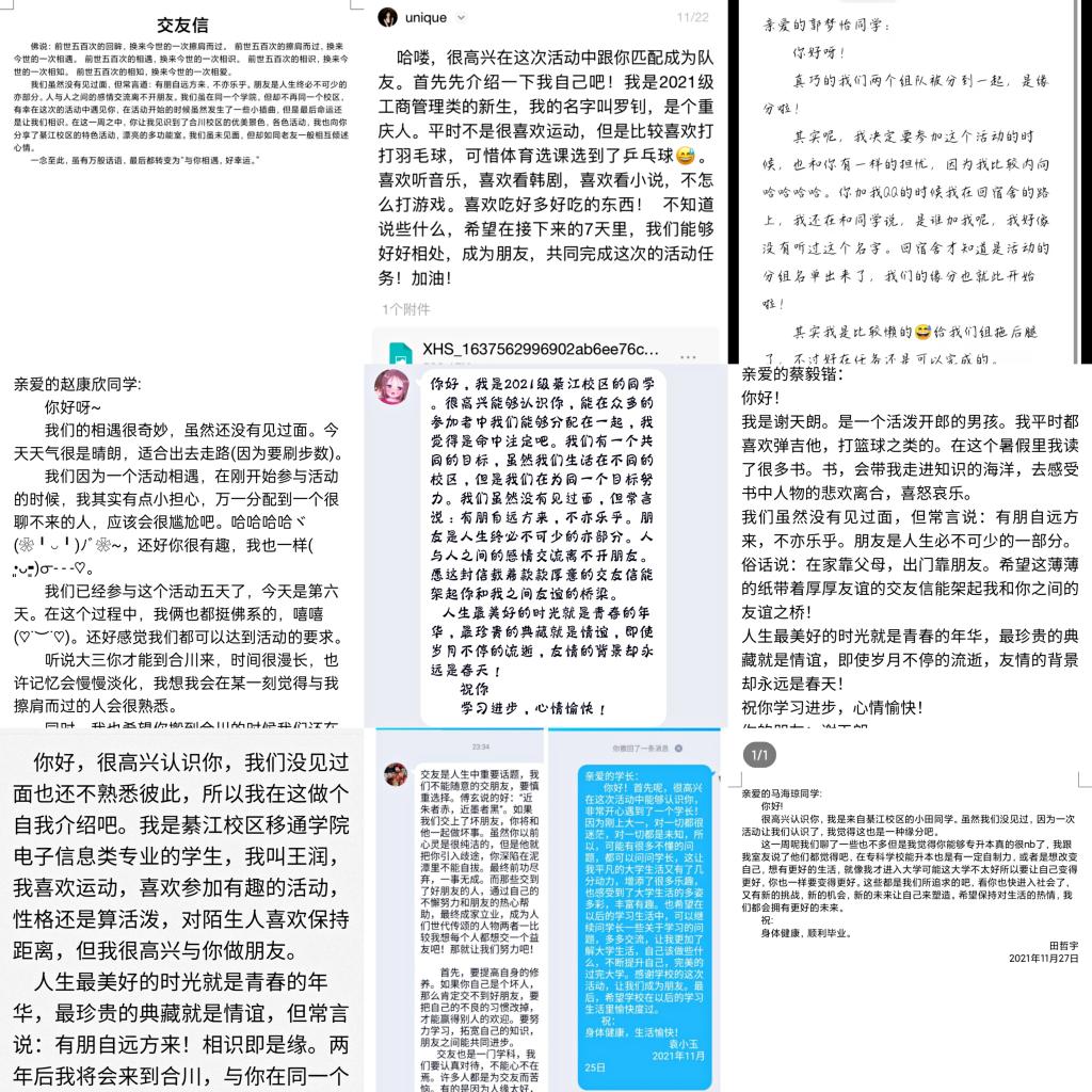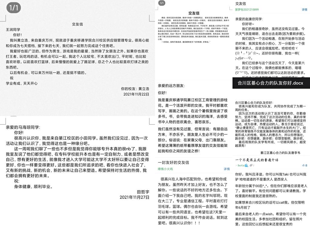 “开始不太习惯,信息化时代还需要写书信。后面同伴们都在群内分享了写给合川校区同学的书信,让我很惊讶,这事儿竟然真的有人做。思考了一阵,我该给合川校区的队友写点什么比较好。思来想去,写了我来到綦江的点滴,也表达了我的近况。对方给我的回信是念念不忘,必有回响,或许这也是一种期待和慰藉吧。”
