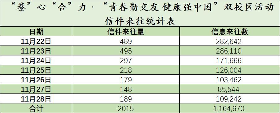 11月22日,为期一周的“綦”心“合”力双校区千人朋辈交友活动拉开帷幕。活动以书信交流、大咖书籍分享、勤运动打卡为媒介,搭建起合川、綦江两个校区学生互动的桥梁。截至目前,双校区参与人数近千人,往来书信达2000余封,大咖传记阅读超1000人次,阅读心得分享突破5000次,健身打卡总里程达100000余公里,可往返合川、綦江校区近340次。