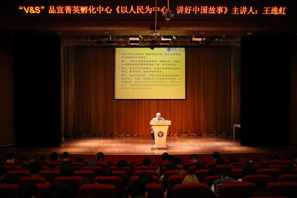 3月15日, 宣传新闻中心、别都书院联动名师课堂,于下里巴人剧场开展“V&S”品宣菁英孵化中心大咖讲座第一期。本次讲座邀请到国家文化部优秀专家、重庆市作家协会原副主席,重庆工商大学原教学指导委员会副主任,原校教学督导督察文法组组长,著名电视剧《山城棒棒军》编剧王逸虹教授,讲座以《以人民发展为中心,讲好中国故事》为主题,共吸引700余名移通师生,反响热烈。