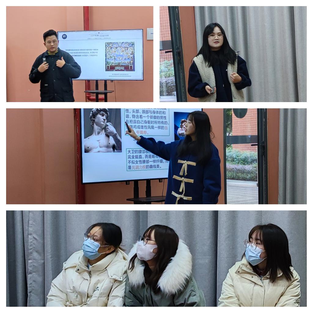 从第四组开始,每组以时间为线,以历史为基,以作品为辅,从米开朗基罗的童年经历、青年成名、而立冠誉、暮年沉淀等方面,逐步地探析不一样的米氏。首先引领大家进入米氏童年生活的是来自2020级广播电视编导专业的刘乾成同学为代表的小组,他们从米氏作品之《拉庇泰族人和半人马的战斗》入手,引出米氏作品中的扭曲之处,继而分析米开朗基罗早期创作扭曲之源头,主要原因在于其家庭背景、入学体验与伯乐的赏识与指责。紧接着是来自2020级通信工程专业的李辰晖同学为代表的小组,他们侧重于分析时代背景影响之下的米氏,探索从中世纪的噩梦中惊醒的世人,渴望着摆脱宗教神学的浑噩蒙蔽,沉睡已久后的初醒,有对旧秩序的怀疑,也有对新秩序的憧憬。正是在这样的背景之下,米开朗基罗有着玄妙而又不切实际的幻想,他开始在合理存在的事务中思考,去表达他的观点,无关形势,用理性去思考,去创造。米氏在作品中所表达的正是他对那个时代最好的反馈,他在艺术中的留痕也正是他对当时社会的批判与继承,在思想上的反思也正是他对人文主义思想最好的理解。