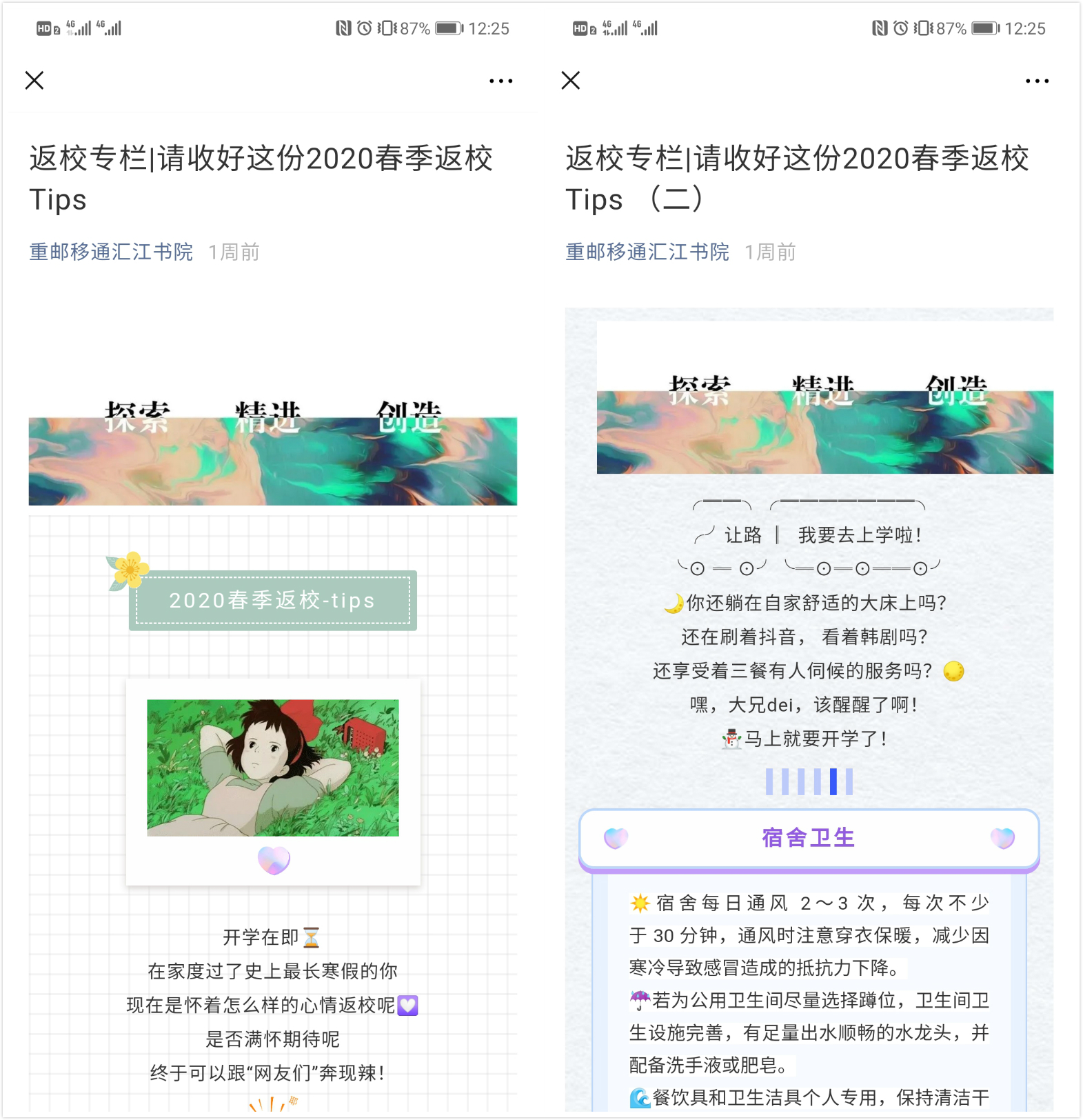 5月17日、18日,汇江书院通过微信公众平台发布专项推文,以轻松诙谐的风格向同学们支招返程准备及注意事项,同时针对健康防护、宿舍生活等方面提供建议,营造和谐有序的返校氛围。汇江书院2019级的李子凡同学说,一条条小建议让他感受到书院对返校同学的关心,也因此更加安心,相信在在各方关怀之下,自己一定可以顺利返校,徜徉在美丽的移通校园里。