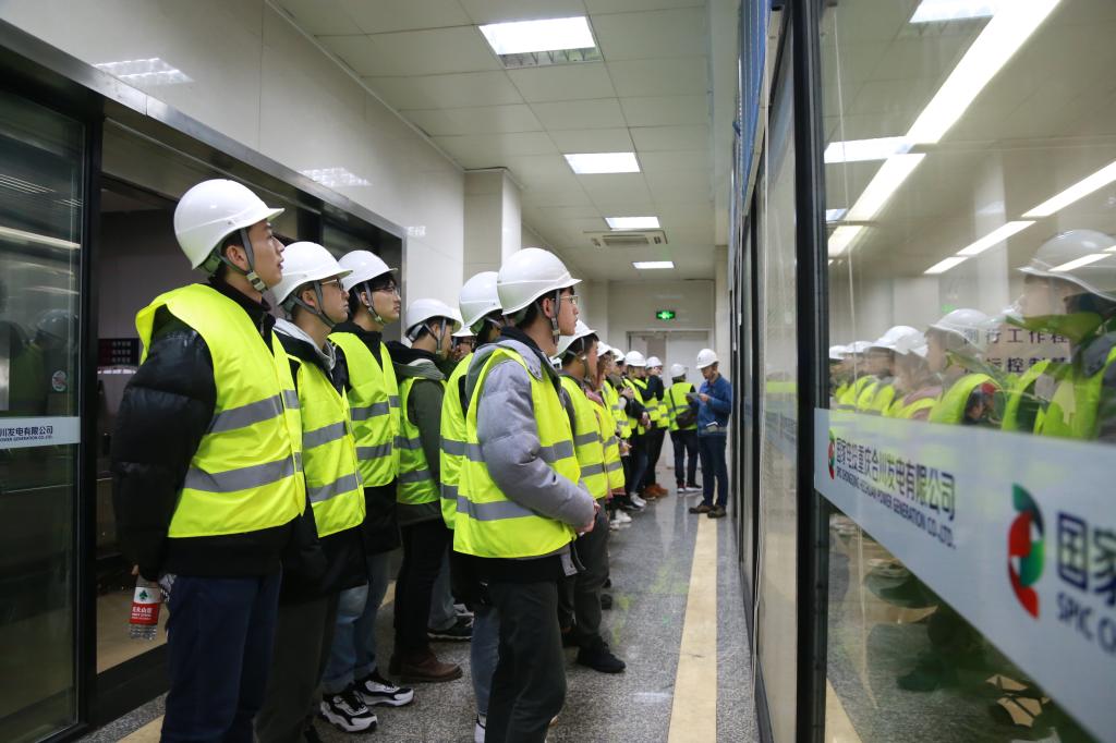 参观学习环节,在生技部主任助理王旭辉、季显华老师等相关工作人员的带领下,杨佳义和曹强老师与同学们首先接受进行安全教育,使学生熟悉发电厂的环境布局,明确发电厂设备在高温高压环境下的运行特点,树立安全责任无小事的安全保护意识;其次,进入厂区参观,沿一期冷却塔、一期固定端、一期12.6米汽机平台、一期集控室、二期汽机平台、二期集控室、二期升压站,特别是在锅炉系统及运行等环节都做了详细了解。最后,在电厂王旭辉高工的带领下参观一楼基础配套设施,到二楼影音室观看企业宣传片、微电影,感受央企浓郁的企业文化、车间一线员工苦涩与喜悦参半的成长经历。并听取王旭辉高工关于电厂自动化控制系统的设计、控制与工程实现等相关专业知识,增强了学生从事电力行业工作的信心。整个参观过程师生感知了发电环节到最终升压输电整个工业过程的复杂性,认识到发输电技术要求工作人员必须具有扎实、丰富的专业知识和严谨的工作态度。