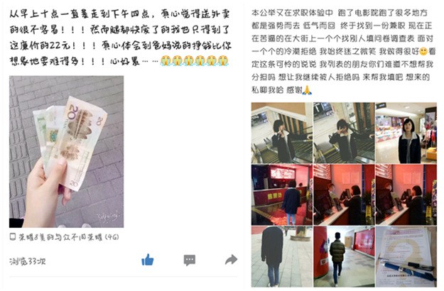我们的第一站是一个花卉店,但由于我们对植物及花卉相关知识的匮乏导致我们与这个工作岗位失之交臂。这让我们深刻的体会到:你涉猎的越多人们给你的机会就越多!那么,为何不在我们闲暇之余多多的看看书来开阔我们的眼界呢?俗话说得好“技多不压身。”这也恰恰反射出我们当代学生的现状。我们生活在一个电子产品发达且先进,数据大爆炸的时代!而活在当下的我们甘愿选择做一枚低头族,做一只蜗居在“壳”里的蜗牛,做一只望天而笑的井底之蛙。当然,我并不是要以偏概全,但这也是当代学生所存在的状况。我不得不为之叹息,祖国的花朵要如何娇艳的盛开?所以,让我们也时常的抬起头看看世界的变化,它带给我们的变化。让我们我们并没有气馁,仍在不停的寻找,功夫不负有心人,在最后我们找到了一份做问卷调查的工作。所有的队员都全身心投入其中。“不想找到工作的人,一定是一个不愿上进的人”,争做一个上进的人,我想这应该是每一位为求职做着准备的大学生应该具有的品质!感谢这次活动让我受益良多,我还会在以后的多期活动中努力学习切身体会!爱因斯坦曾说:“在学校和生活中,工作的最重要的动力是工作中的乐趣,是工作获得结果时的乐趣以及对这个结果的社会价值的认识。”那么,就让我们在工作中感受生活,体验乐趣吧!
