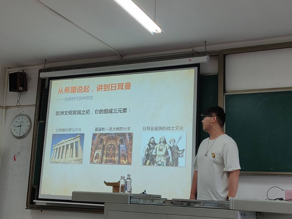 为贯彻落实“以学为中心”的教学理念,提高学生的课堂参与度与学习主动性,达成通识教学部“知识+能力+素养”的育人要求,培养学生的合作能力,按照教学大纲和教学计划,开展期末课堂陈述教学活动。随着全国整体疫情防控稳步向好,线上课程转为线下课程,毕瑜老师的《欧洲文明的现代历程》要求学生根据所学,自行制定汇报主题,收集素材,各个小组商讨分工,制作汇报PPT,选1名小组成员课堂汇报,其他小组组长评价或发言,最后教师总结补充。