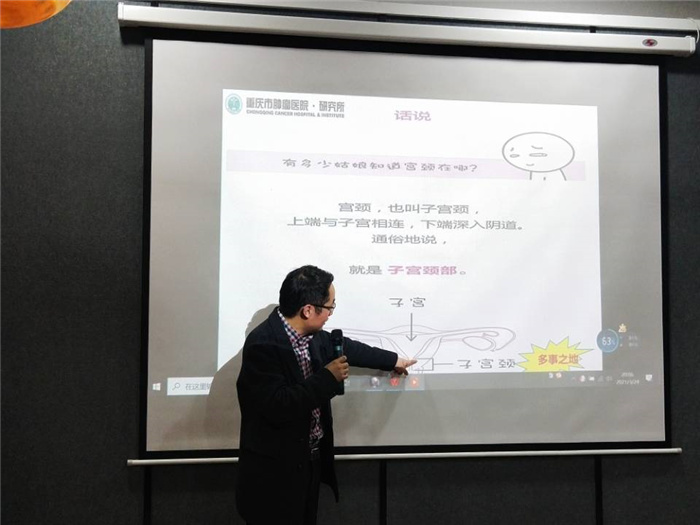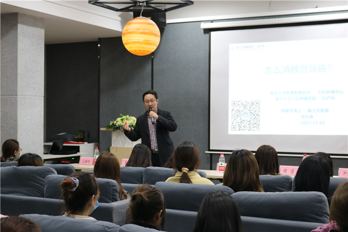 讲座现场,王秋玲主任上台介绍了合川区中西医结合医院妇产科科室的具体情况。随后,龙行涛主任带领在场同学进入了本次座谈会的主题——HPV和宫颈癌的那些事儿。他表示:“作为一名医生、一名教师,我很高兴来到移通,通过座谈会的方式和大家分享有关女性健康方面的知识,让同学们能够更好地保护自己。”