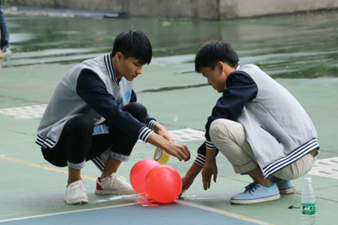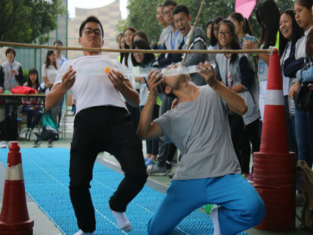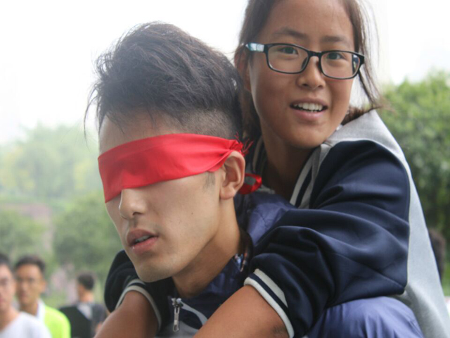 信任与友谊的双重力量,让这二十米的道路成为彼此的指引者。男生蒙住双眼,背起身后的女生。走过通地的气球和障碍柱。步步维艰,一步一停顿,空气似乎被凝固了,众人的双目都注视那稳健的身影,直到他们安然到达终点,气球未破,障碍未倒。一个“失明”、一个“行动不便”他们通过自己的默契配合,圆满完成“瞎子背瘸子”的精彩游戏。