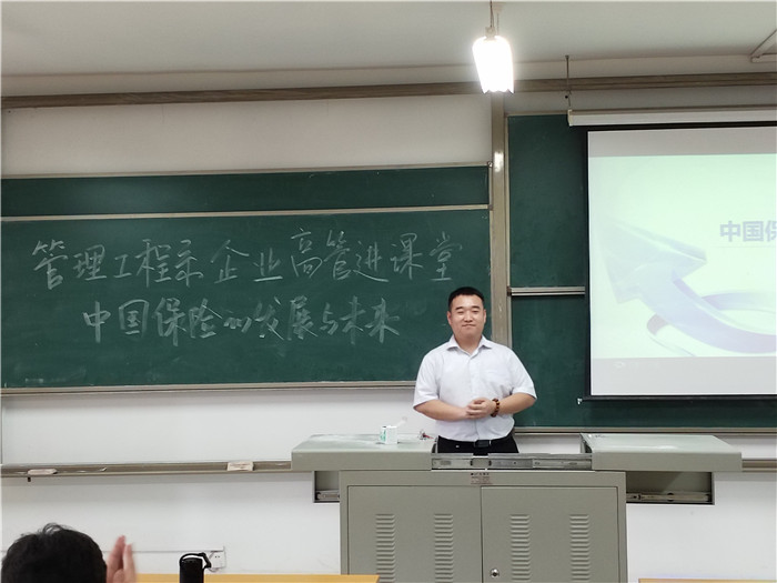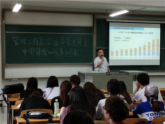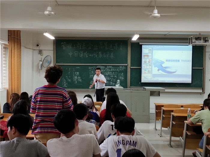 随着我国经济持续稳健增长,居民可支配收入水平不断提高,我国已进入到大众消费的新时代,伴随着大众社会风险意识的提升,居民对自身及家庭的风险保障重视程度也日渐提高。以此为背景,资产评估专业开设了保险学的课程,为了让学生能够更好地理论联系实际,管理工程系工程管理教研室积极进行了教研活动的创新,邀请企业高管来课堂与学生面对面交流。6月11日下午4点在1403教室2017级资产评估专业举办了一场主题为“中国保险的发展与未来”的企业高管进课堂活动,特邀现任湖北保险经代公司营销总监周启龙先生为同学们做交流讲座。