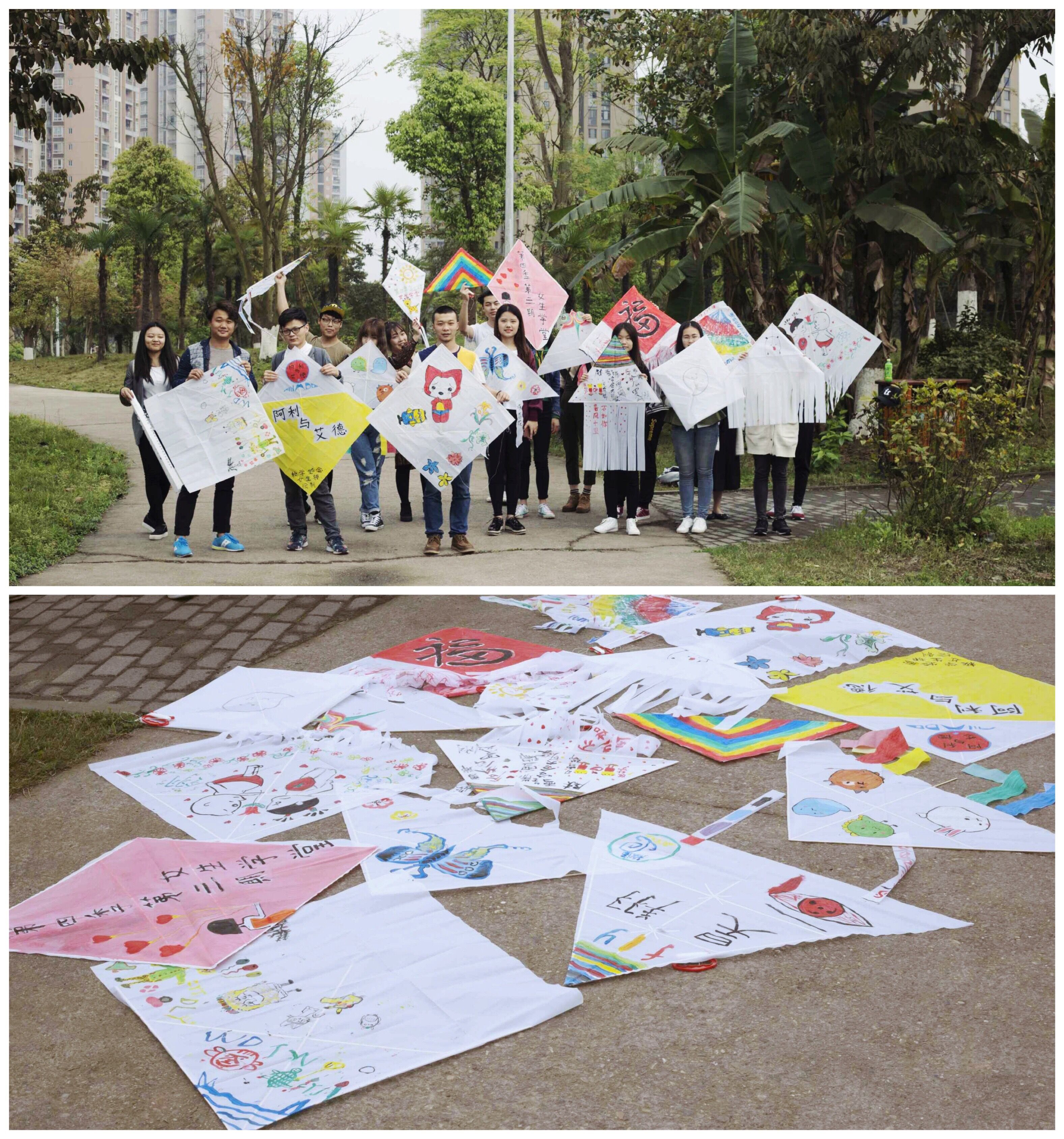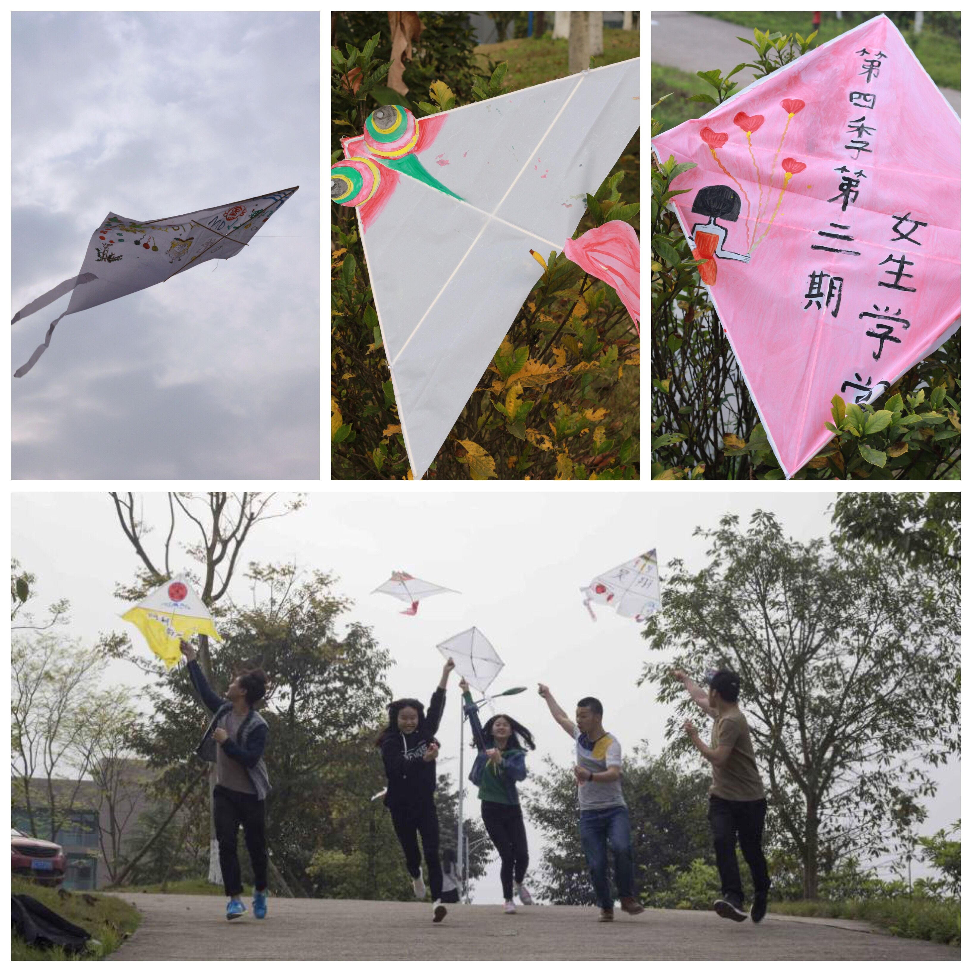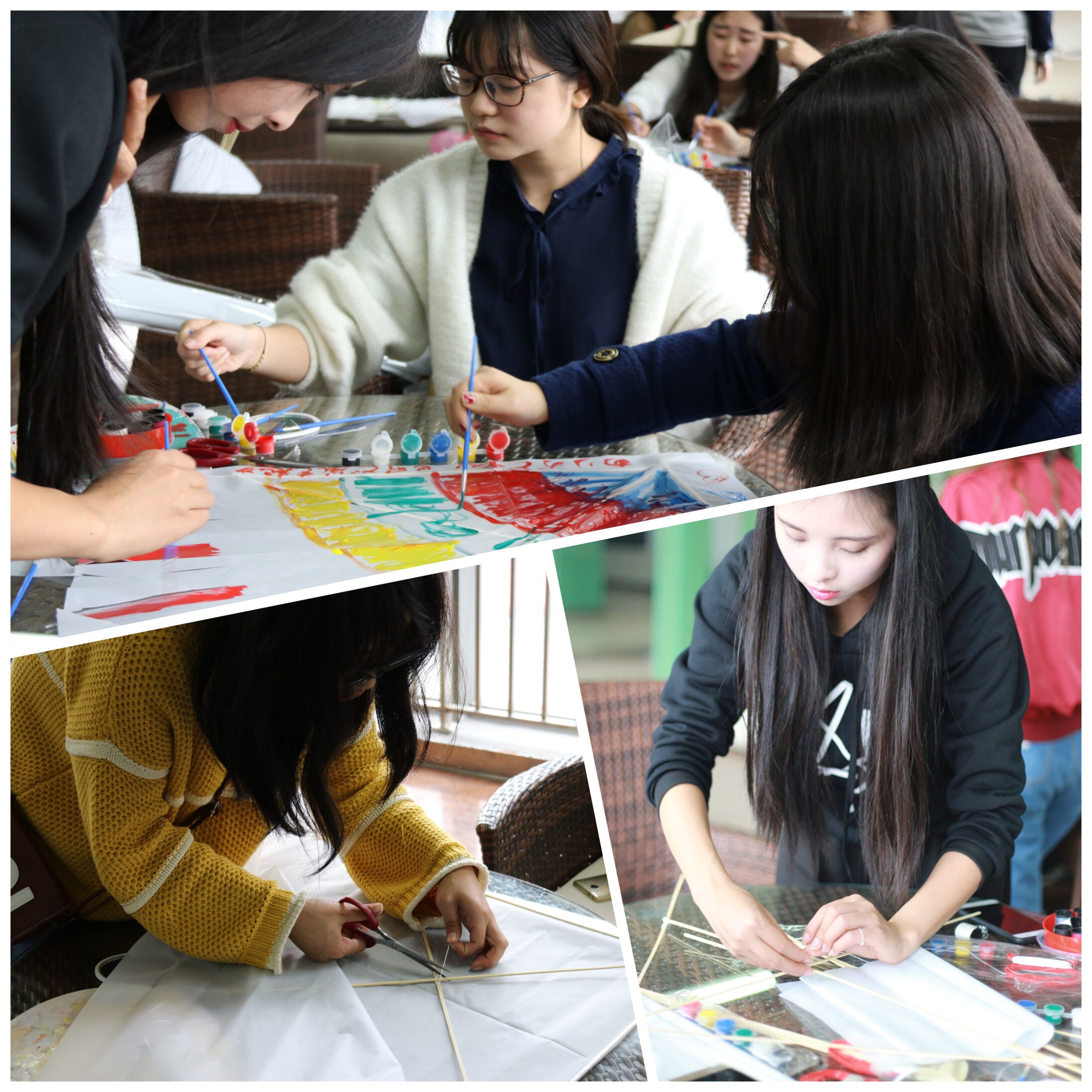 常言道:说起来容易做起来难。四根5毫米宽的竹块拼合成三角骨架,一张白色帆布裁剪成羽翼和尾巴,一针一线将骨架与羽翼紧密连接。心灵手巧的女生们有条不紊,裁剪拼合,穿针引线,信手拈来,四月的阳光映在她们幸福的脸庞,只见她们把嘴一抿,脸上满是美妙而又充满成就感的笑容。
