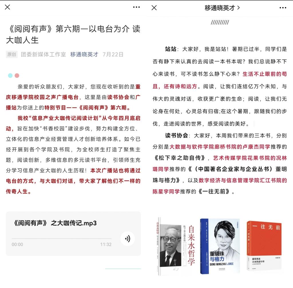 外国语学院暑假期间,师生联系紧密。教师通过网络,指导各年级学生进行阅读,和学生共读大咖传记。由老师引导学生学会选择有价值的书,养成爱读书的好习惯。学生们通过阅读获得丰富的语言材料,还能鉴赏文化精品,提高审美。高年级学生根据自己兴趣选择相关外文大咖传记书目进行阅读,并提交经典语句摘录与读书笔记,在暑期继续输入专业知识,并且了解名人传记。促使同学们掌握一定的信息相关知识,并同时提高学生阅读能力、外语语言能力。大数据与软件学院为培养学生“多读书、读好书、会读书”的优良习惯,推动大学生素质拓展。暑期依托超星学习APP、腾讯QQ等软件,通过师生共读、图书推荐、阅读分享(图片、阅读感悟)等方式开展了信息产业大咖传记阅读活动。共覆盖学生2457人,老师21人,同学们积极参与并反馈,老师认真引导。爱莲书院、北山书院、别都书院、花果书院、汇江书院、廊桥书院、鱼城书院等7个社区文化式书院均于暑期建立线上师生沟通机制,发展导师带领学生干部制定暑期阅读计划,定期开展线上读书感悟心得分享。并在返校后于书院空间陆续开展读书沙龙分享会,师生畅谈暑期读书的经历和收获。师生在书院积极营造阅读氛围,丰富书院家文化内涵。其中,北山书院还借助暑期三下乡专项活动,引导学生在为西部农村大力普及和推广国家通用语言文字和普通话的同时,期间采用大咖素材和故事进行互动和讲述,开展留守儿童兴趣课堂;别都书院以“每日一阅读·每日一运动”线上团建活动鼓励教师、学生干部以及百人成长档案项目成员参与进来,通过微信APP线上阅读、阅读群每日打卡的方式分享读书感悟,多渠道、多方式地推进暑期阅读计划在书院队伍的落地;汇江书院组织的“品读传记,与大咖对话”主题活动,学生在线上阅读共计近2000小时,形成读书笔记、读书心得近200余篇。