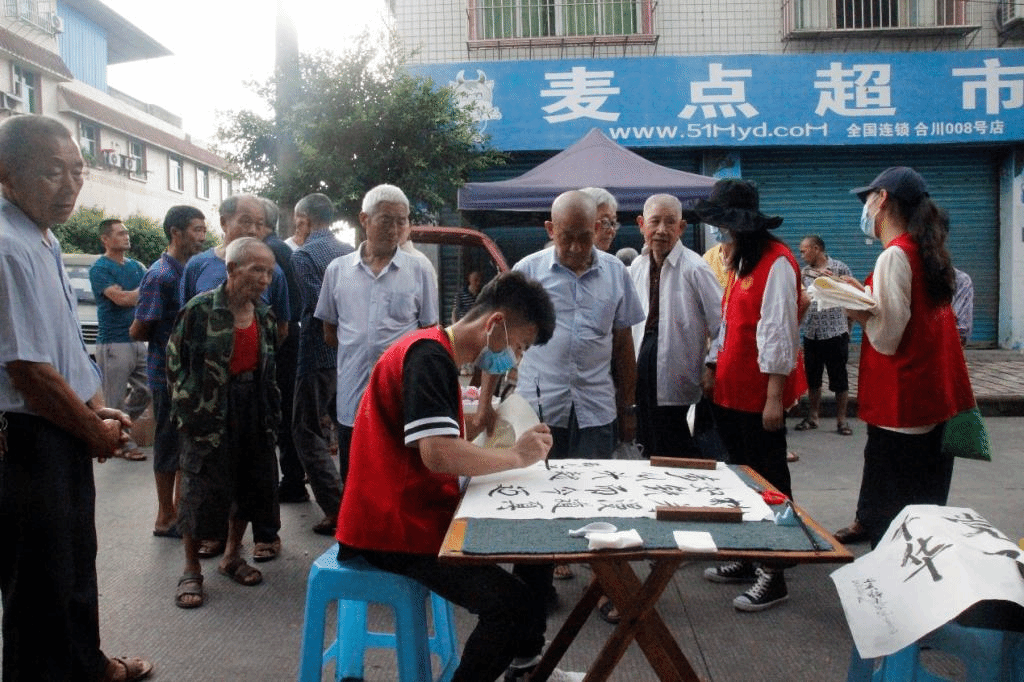 “走过路过,都来看一看瞧一瞧,我们为大家免费赠送书法对联。”在思居村的集市中,可以清晰地听见团队成员吆喝的声音。