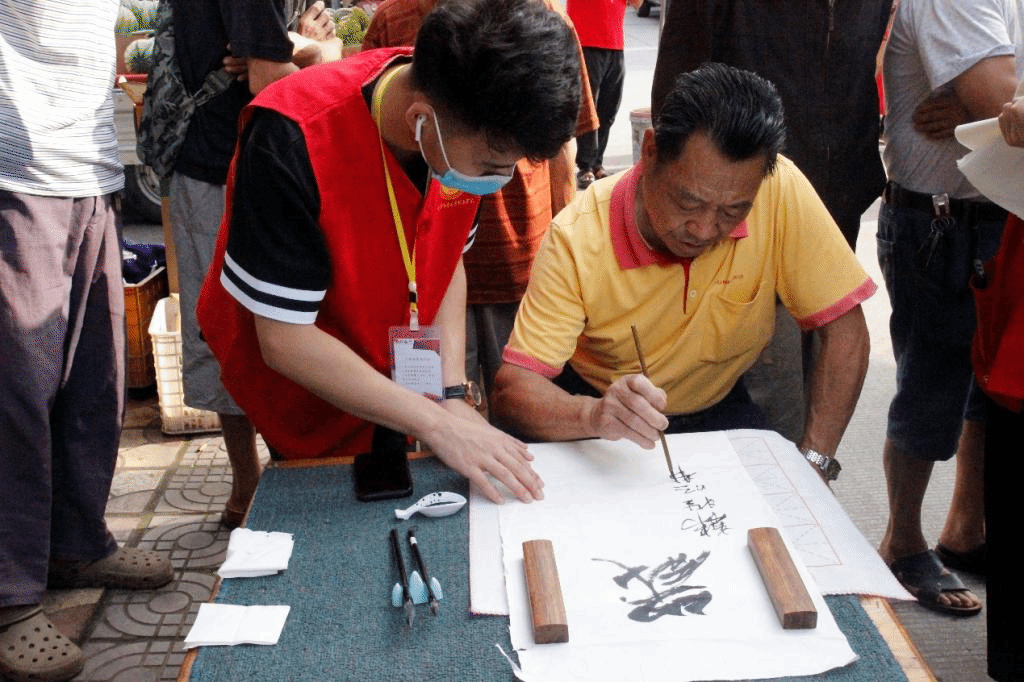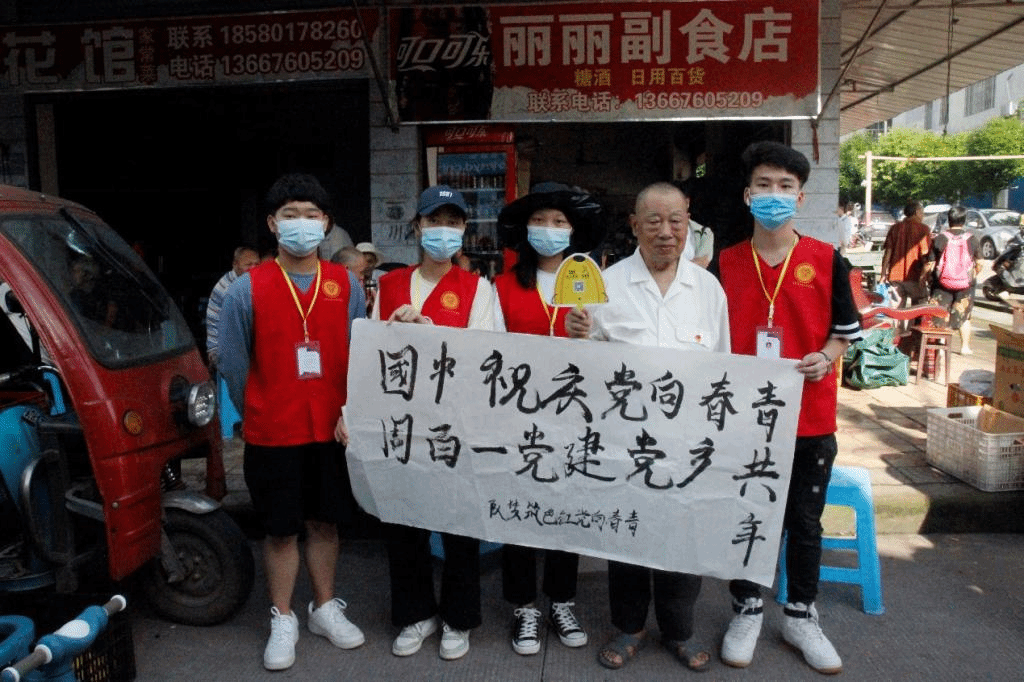 思居村村委会大楼右拐,是热闹喧哗的农贸市场。团队成员带着毛笔等书法用具,与一家自营超市协商达成合作,在老板的热情帮助下,一个简易却具有传统文化气息的书字摊点悄然诞生。一位名叫韩爷爷的村民,今年已经86岁,看到书法,十分兴奋,主动驻足脚步在现场留下“社会和谐,祖国万岁”书法作品。字里行间,极大地突显了老一辈人对人民幸福生活、祖国繁荣富强的殷切期望。同时,团队在后期了解到,韩爷爷还是一位拥有65年党龄的共产党员。交流过程中,他与队员分享了曾经亲自经历的红色岁月,队员感慨良多,韩爷爷的事迹,不仅鼓舞着团队成员,更激励着队员纷纷向其学习和看齐。