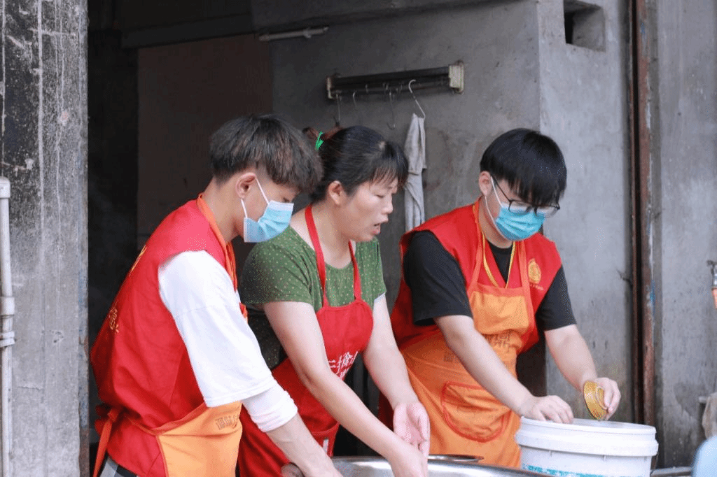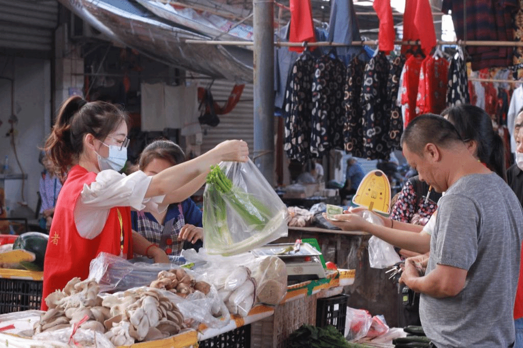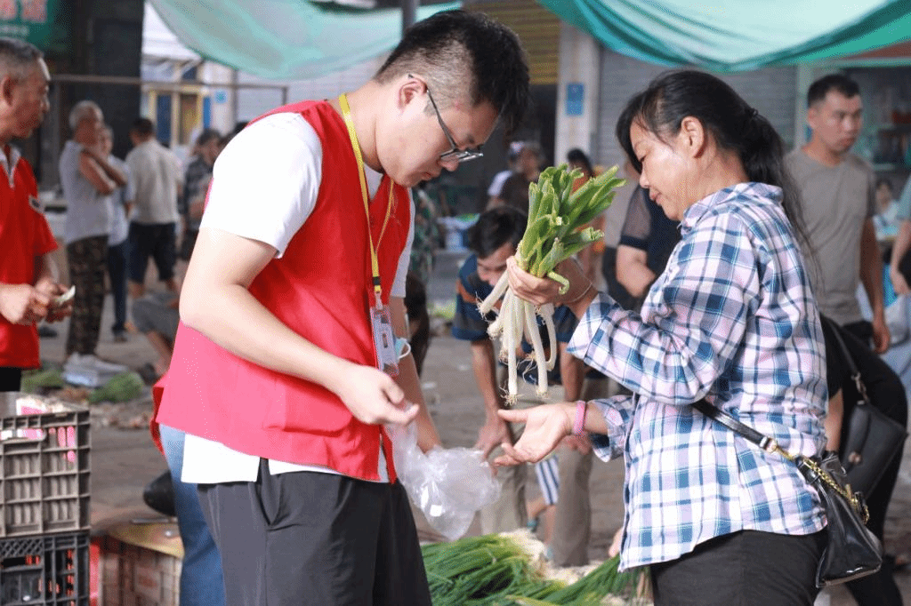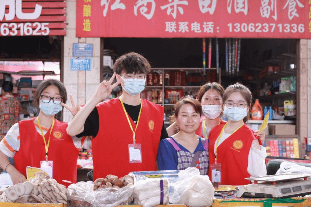 在集市现场,团队成员分成了三个小组。部分队员走进饭店帮助老爷爷清洗餐具,老爷爷与队员热情交流,分享日常生活中、店铺营业时遇到的一些趣事。还有部分成员走进摊点,帮助售卖的村民一同吆喝,新鲜的蔬果,热情的声音,吸引了大批行人驻足围观,市摊货物没过一会儿,便被村民纷纷购买而空。摊点的货主村民,对团队成员的助力,表示十分感谢,纷纷竖起了“大拇指”以示赞许。