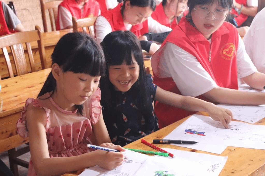 绘画课上,志愿者从故事入手,先调动小朋友的积极性,再带领小朋友一步步画出狐狸和葡萄,从最基本的种子到发芽成长的大树,从圆、三角形等组合形成的基础图形到形态可爱的狐狸,细致入微的教学让小朋友们倍感亲切。在小朋友们画笔下,一个个形态憨厚的小狐狸逐渐形成,志愿者从小朋友清明纯透的眼睛中,看见了留守儿童该有的意气奋发和勇气。