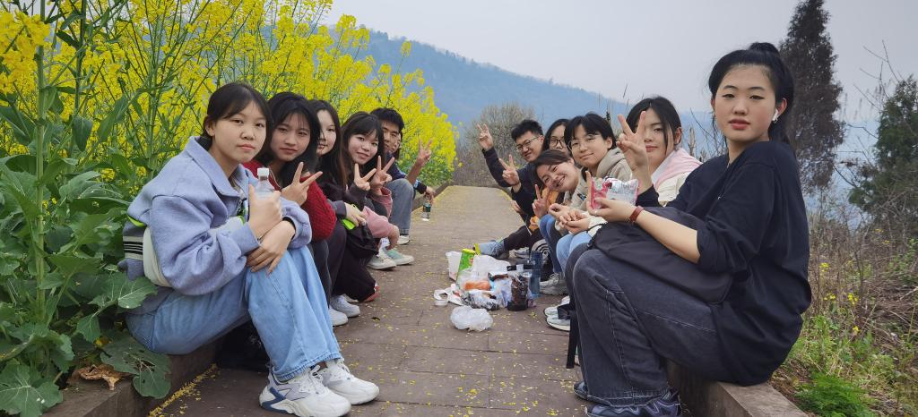 走上台阶,我们开始翻越第一座山。大家气喘吁吁地翻过小山后,在一片满是油菜花的田地中席地休息,并将老师早早准备的干粮摆在人群中央,以便大家补充能力。油菜花随风轻舞,它的叶落在发丝上,变成美丽的装饰,更使大家感受到春天的美好。休息片刻,我们在欢声笑语中,收拾干粮,准备继续向龙游寺出发。