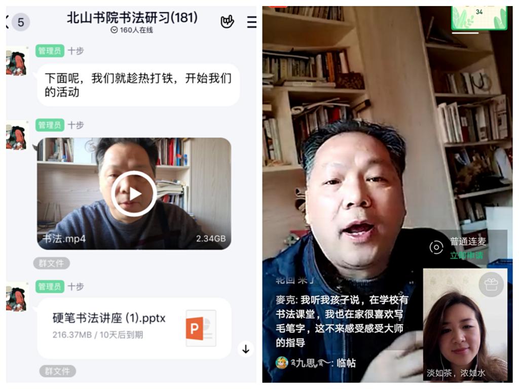 “兰老师,您好!我听孩子说,今天学校在直播书法兴趣课堂,我在家空闲的时候也喜欢写一写毛笔字,特来请教一下兰老师。”直播间的对话屏发来这样一段话,是北山书院的同学家长发来的,学生家长也参与了书法学习交流和互动。停课不停学,隔离不隔离爱,书院“家长”和学生家庭“家长”双向联动,用行动传递朋辈对学生的陪伴、引导和关怀,开启了云端战疫和学习的新举措。