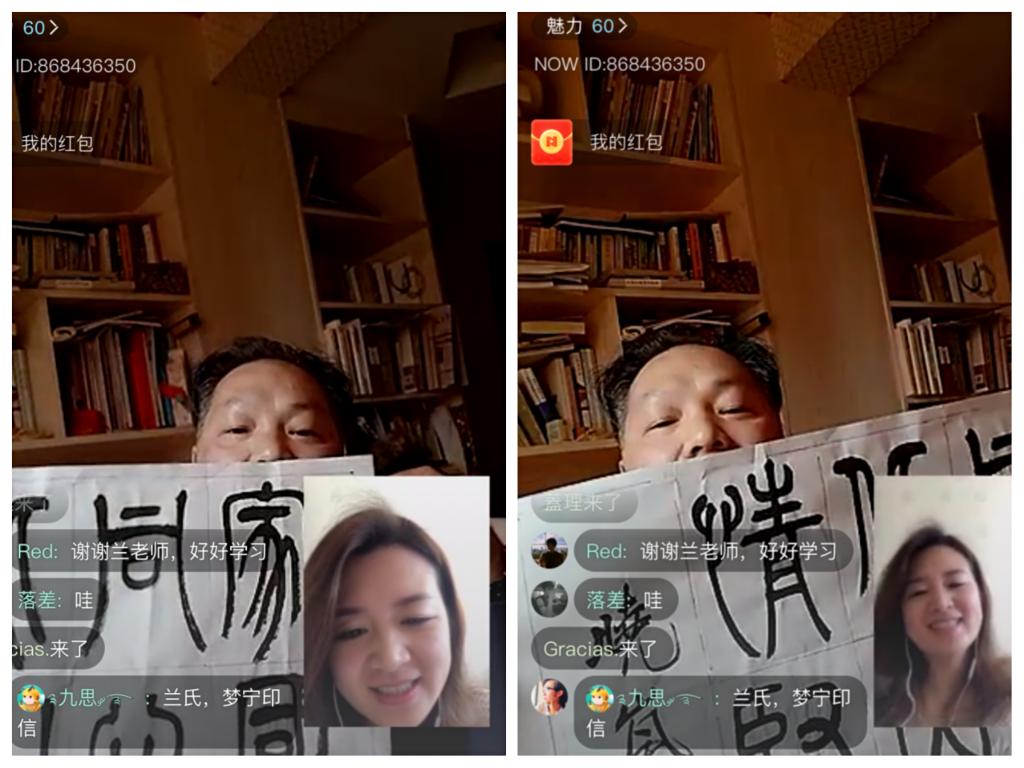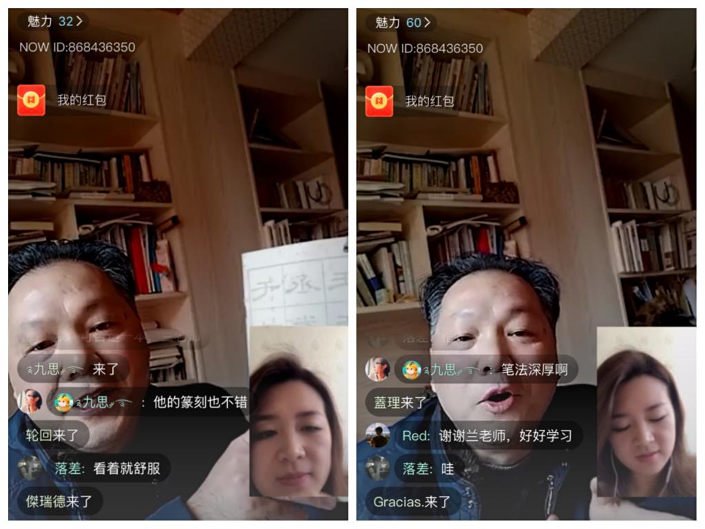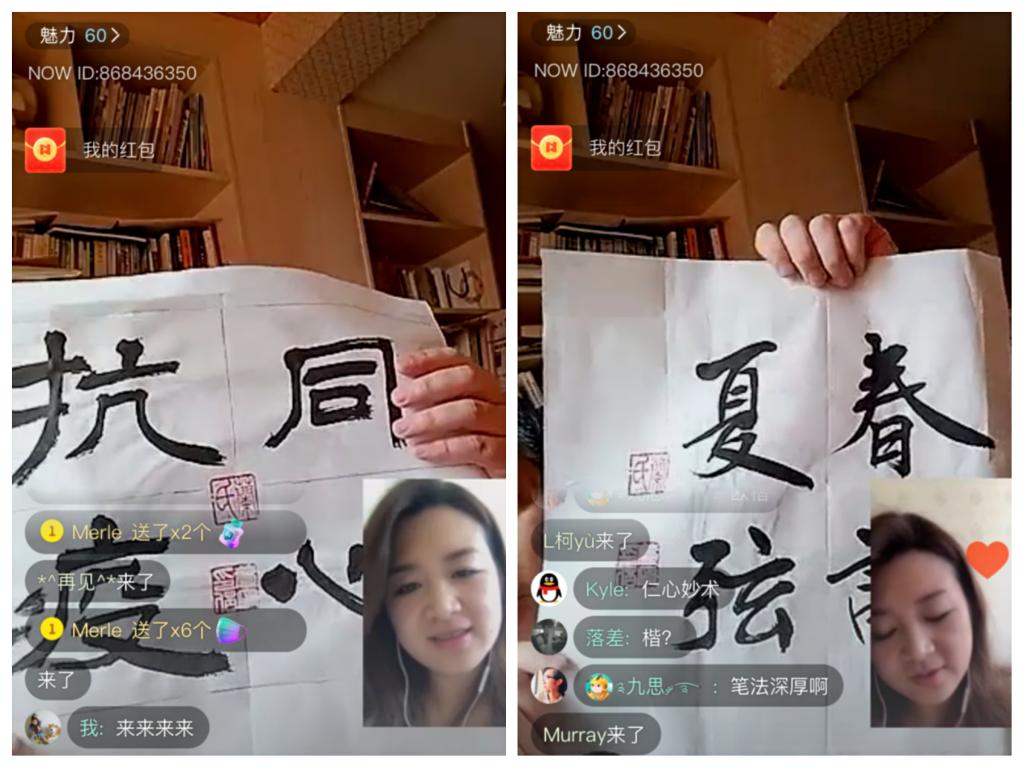 “兰老师,我对书法很喜欢,可是对书法的了解薄弱,您可以给我们讲讲初学者应该如何展开书法练习吗?”直播间有同学这样问道。“同学们,我从三个方面给大家解答这个问题吧!一是给大家简单的介绍一下临摹的小知识,书法呀,它有毛笔书法和硬笔书法之分,我们一般指的书法呢,主要是由毛笔书写字体,这也是书法的狭义概念。书法字体从古到今的一个演变历程,主要经历了甲骨文、金文、石刻文、篆书、隶书、草书、行书和楷书。二是给大家展示几个我刚刚自创的作品,分别是隶书‘同心抗疫’,楷书‘仁心妙术’,行书‘春诵夏弦’,篆书‘家国同心,北山情坚’,送给奔赴战疫一线的医务工作者和同学们,希望疫情防控阻击战早日取得全面胜利,更希望同学们能够在书法练习的兴趣道路上日复一日坚持,有所收获。三是我建议初学者入门以楷书为主,学习书法要习其根源,楷书有所效果后,再学习练习小篆、隶书、行书和草书。”兰老师并不断地为同学们展示和介绍收藏在书架的各类书法大家的作品,直播间师生频频互动,效果良好。