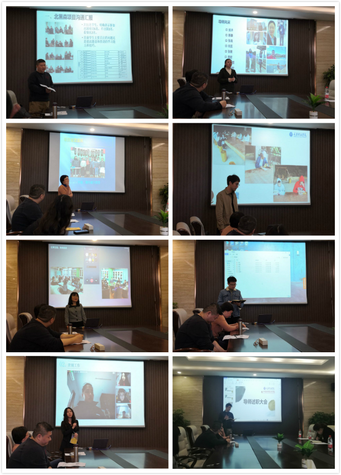 张洋等八位项目导师依次上台,向各位领导及同事总结自己的导师工作。他们主要从以下几个方面陈述了对学生各个方面的指导: