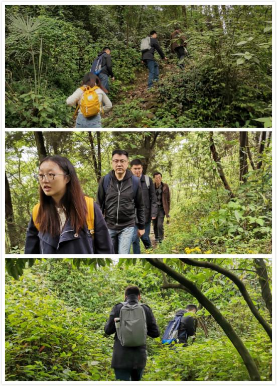 由于钓鱼城历史文化研究中心的老师一直面向全校学生开设有《钓鱼城与世界中古历史》课程,钓鱼城范家堰遗址考察完以后,老师们在资深钓鱼城专家——池开智老师的带领下,不走“寻常路”,爬坡上坎,从范家堰遗址直接到达王坚记功碑、水阁凉亭,又翻过马鞍山、走过长沙田,到达了钓鱼城北边的出奇门,看了明代的摩崖造像,最后返回考察了土地岩题刻。