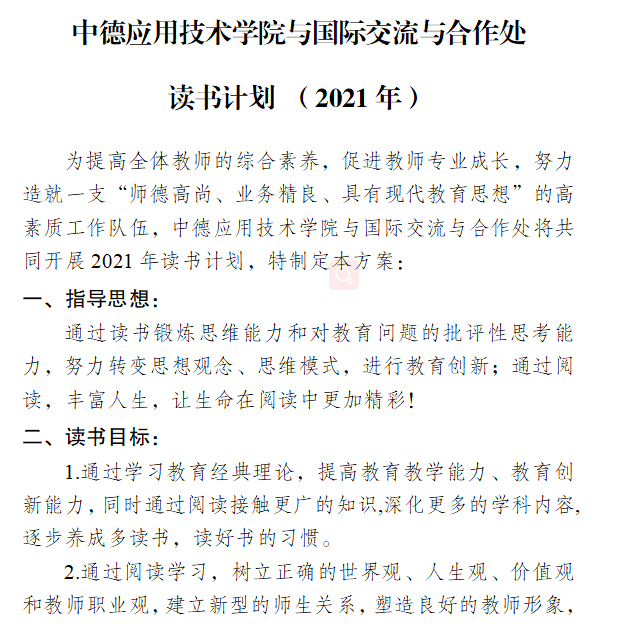 本学期初,国际交流与合作处(以下简称“国际处”)和中德应用技术学院(以下简称“中德学院”)积极响应学校的号召,联合开展了全体教师阅读工作,制定了科学详细的年度读书计划,还将董事长推荐的“信息产业大咖传记阅读计划书单”作为必读书单,希望通过阅读提高全体教师的综合素质,努力造就一支“师德高尚、业务精良、具有现代化教育思想”的高素质队伍。