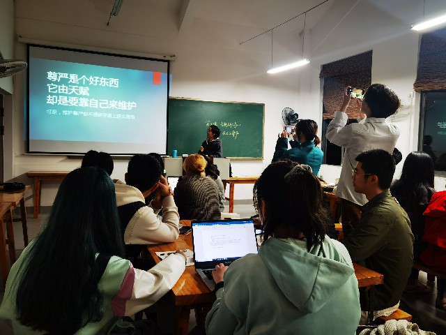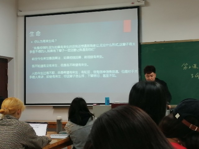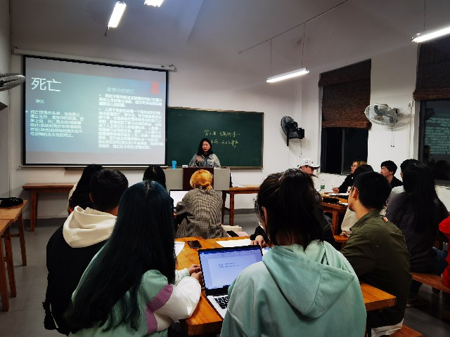 谈到生命,廖祖勇同学分享了他对这一主题的理解。首先,他提出了一个问题“你是否相信有来生?”这一问题引发了大家的讨论,有的同学认为有来生,因为相信有因果轮回,所以上一世做的好事会对下一世的轮回有益,反之亦然。而有的同学则认为哪有来生,因为人的生命只有一次,要活在当下,关注自我,及时行乐……廖祖勇同学用余华先生的《活着》做了解读。“人是为活着本身而活着的,而不是为了活着之外的任何事情而活着。”让我们深有感触。不过,针对这个话题,毕然老师也向我们提出问题:“你们觉得福贵幸运吗?”一些同学摇摇头,认为他是不幸的,因为他亲眼目睹了自己亲人接二连三的去世;而一部分的同学认为他是幸运的,在赌输了全部家当后成了农民,却因祸得福的活下来了。而毕然老师认为生命的真相就是在与亲人不断告别、走向死亡的过程,那是每个人都要面临、无法回避的事实,生命与死亡的距离不过是时间而已。