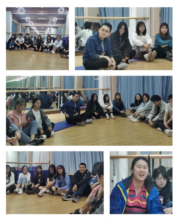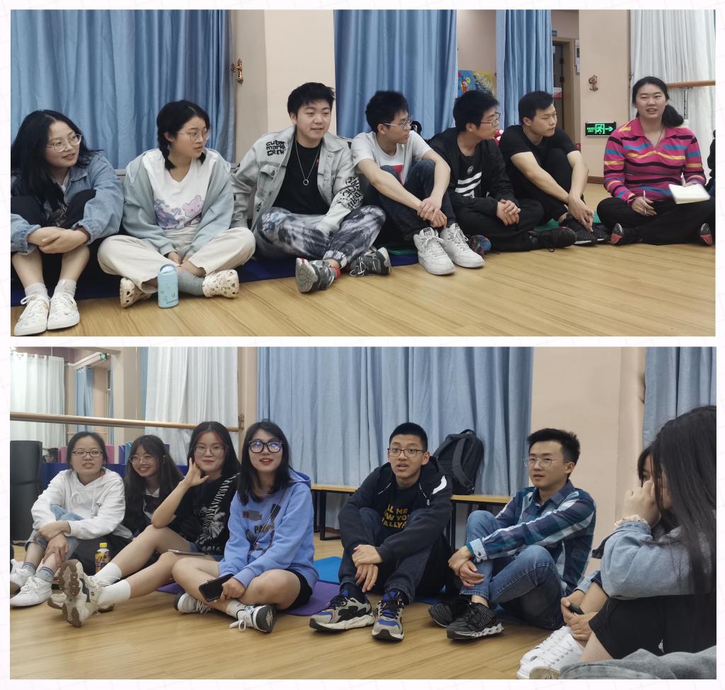 在场景置换中训练中,韩老师请每一位同学首先在意识中创建一个主题,然后在北山书院排练厅中席地而坐,以放松的状态围坐在一起对自己的建构的主题进行10分钟静思延伸。