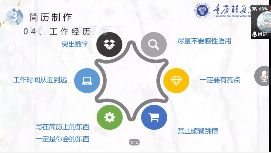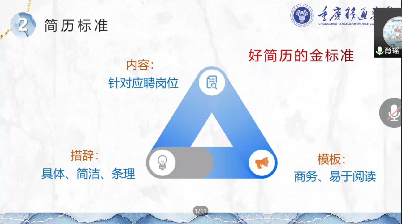 本期沙龙邀请到我校创新创业导师库成员肖瑶老师为同学们分享简历制作的技巧。