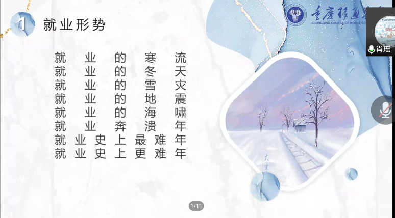 活动伊始,肖瑶老师为我们介绍了当前严峻的就业形势,她谈到,在如此大的就业压力下,国家也多举措来促进高校毕业生的就业。目前人社部将通过实施百万青年见习岗位募集计划,加大中小微企业吸纳毕业生的就业支持举措,简化优化毕业生的就业手续等方式,来拓宽高校毕业生市场化社会化就业渠道。