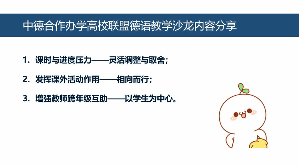 饶前程老师做了“中德合作办学高校联盟德语教学沙龙”内容分享。饶老师曾于本月参加中德合作办学高校联盟主题论坛暨德语教学沙龙,他结合我院德语教学实际情况以及近期欧标德语考试情况,分享了论坛上的一些经验和建议:1.关于课时压力与教学进度。中德合作办学模式下的德语语言教学普遍面临课时和教学进度的压力,因此要对教学内容和环节进行灵活调整,对一些理想化的互动环节做一定压缩,对课后练习和练习册内容做一定取舍。2.发挥课外活动/第二课堂的作用,使其与德语教学相向而行,帮助提升学生学习动力和效果,尤其在临近等级考试时,可以安排内容相关的德语角等活动。3.增强教师跨年级互助。进度压力小、暂时不考级的年级,任课老师可以更多地帮助急需考级的年级和班级。
