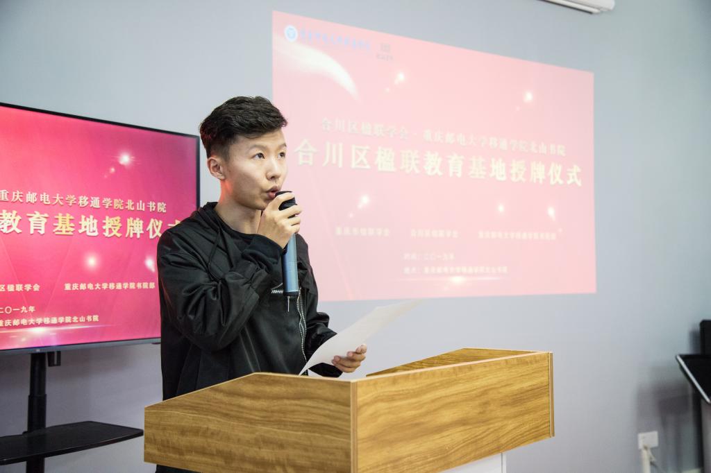 北山书院学生发展导师卢柯毓宣读重庆邮电大学移通学院北山书院建立合川区楹联教育基地的申请报告,并就北山书院发展概况作了介绍与解读,表示将与合川区楹联学会培养学生以“习惯养成”“文化传承”为轴的坚韧力主线,强化学生学习中华文化的氛围营造,引导学生在文化传承中受益,古为今用。