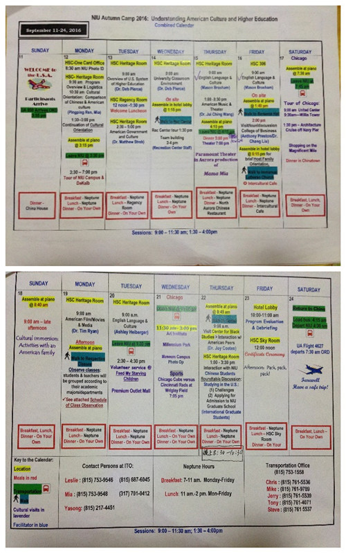 经过一夜的休整,第二天,我们正式开始了我们的学习和体验生活。拿到两周的课程和活动安排,我仔细研究后,不得不称赞NIU的国际培训办公室的项目安排。在短短两周时间里,他们不仅仅给我们安排了美国高等教育、中美文化对比、美国政治及其文化、美国音乐戏剧、英语语言与文化等课程,还安排及其丰富的课外活动,比如校园参观、团建、戏剧观看、参观教堂、芝加哥旅行、义工活动、专业课观摩、垒球比赛观看、黑人文化中心参观等,让我们全方位地了解美国大学生的学习和生活,深入地了解美国生活和文化。我现在回头看,也会惊叹NIU国际培训办公室的这一切安排,确实他们的安排都有条不紊地进行,达到了他们预期的目的,让我们此次参加项目的老师和学生真真实实地感受、了解了美国大学生活和美国文化。