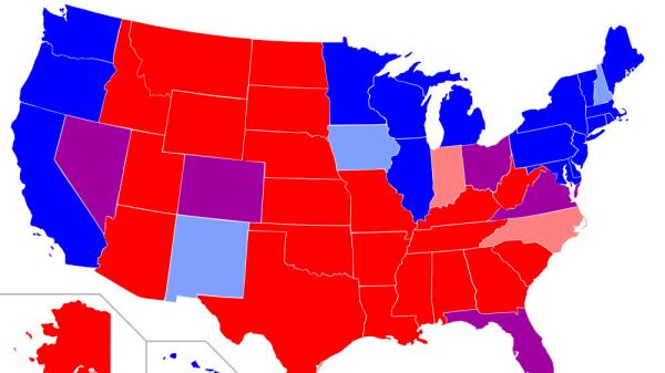 在美国有红州和蓝州之说。红色的州都是支持共和党的,蓝色的是支持民主党的。由于各个州政治观点基本上稳定,因此如果把每次总统竞选或者中期选举(总统大选之间逢双的年份)往地图上一标,中间一大批总是红色的,而西海岸和东北部是蓝色的。在红色的州里,大部分居民从事传统行业的工作,包括农业。他们思想相对保守,奉行靠自己白手起家实现美国梦的理念,对国家和世界不是很关心。他们反对大政府,认为每个人管好自己的事情就好了,这便是共和党理念的核心。在蓝色的州里,人口非常多元化,而且两级分化严重,一方面那里聚集着很多精英阶层的人士,从科技界、金融界到娱乐圈,另一方面那里有很多靠吃救济的下层人士。精英人群中,不少奉行自由主义,比较支持民主党的政策,而下层人士,更是民主党所主张的大政府,高福利的受益者,因此他们支持民主党。
