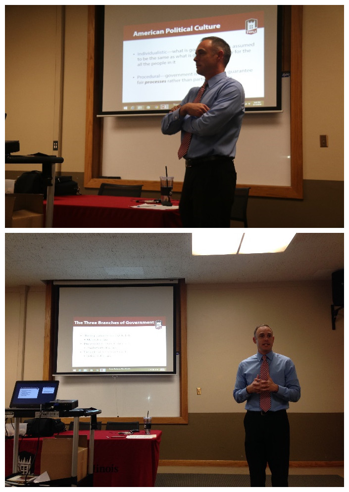 接着,在交流学习的第二天下午,我们有幸聆听了Matthew J. Streb教授给我们讲解美国政府及文化。Matthew J. Streb教授是北伊利诺伊大学大学政治科学系的主任,他是全国有名的选举专家,主要研究无党派选举和司法选举。他的主要著作有The New Electoral Politics of Race和Rethinking American Electoral Democracy。此外,他的文章发表在许多家期刊杂志上,包括Political Research Quarterly, Public Opinion Quarterly, State Politics and Policy Quarterly, Political Behavior, Social Science Quarterly, Election Law Journal等。他的文章内容和观点常被现全国、州或者当地电视或广播节目引用。他还是Riley O’ Neal Show的每周嘉宾。能够有机会听Dr. Streb讲美国的政府及文化是我们的荣幸。