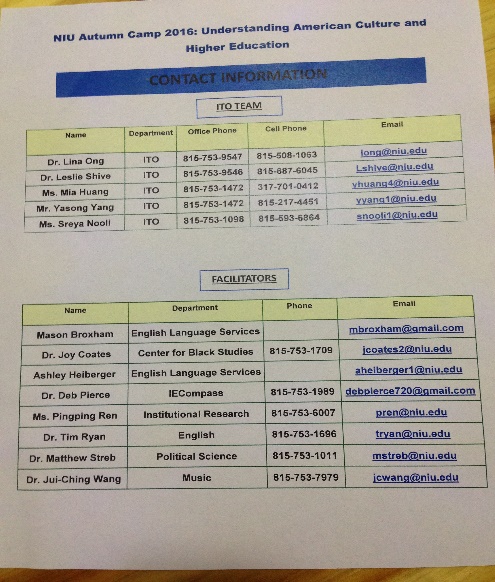 除了合理的教学和生活体验安排之外,我们还得到许多其他资料,包括国际培训办公室相关工作人员的电话号码,如果我们有需要,可以拨打上面的电话号码。还有NIU的公交的线路说明图,不仅有地图说明每路车的路径,还有文字说明如何乘坐校车。此外,工作人员还贴心地给我们准备当地餐馆的信息,有名称、地址、联系电话、网址,以便我们通过合适的途径订到想吃的食物。不得不称赞他们考虑周全,让我们一点都不用担心接下来的行程。