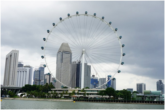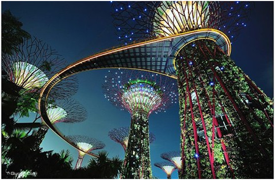 新加坡整个城市都是一片绿油油,我们亲切的叫它璀璨狮城,人们可以在这里体验到发达国家的发达交通,你可以乘坐巴士、出租车、地铁、观光车、甚至摩天轮游览观光。新加坡的这个摩天轮叫“飞行者”,一共165米,旋转一周大概33分钟,在摩天轮上你可以看到对岸的滨海花园的铁树非常漂亮,铁树其实就是垂直空间种植技术,擎天大树的树冠上有光伏电池,白天吸收太阳能,到了晚上可以看到灯光将这座垂直花园打扮得妖娆多姿,铁树上还有餐厅可以用餐,这里是看新加坡夜景的最佳地点之一。在这么一个小城市你随处可以见到绿油油的植物,与他们的垂直种植技术有关。