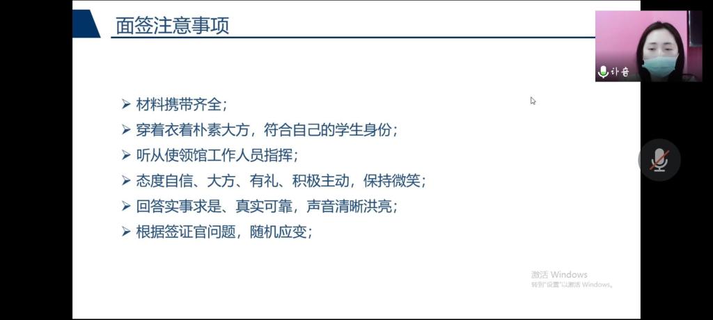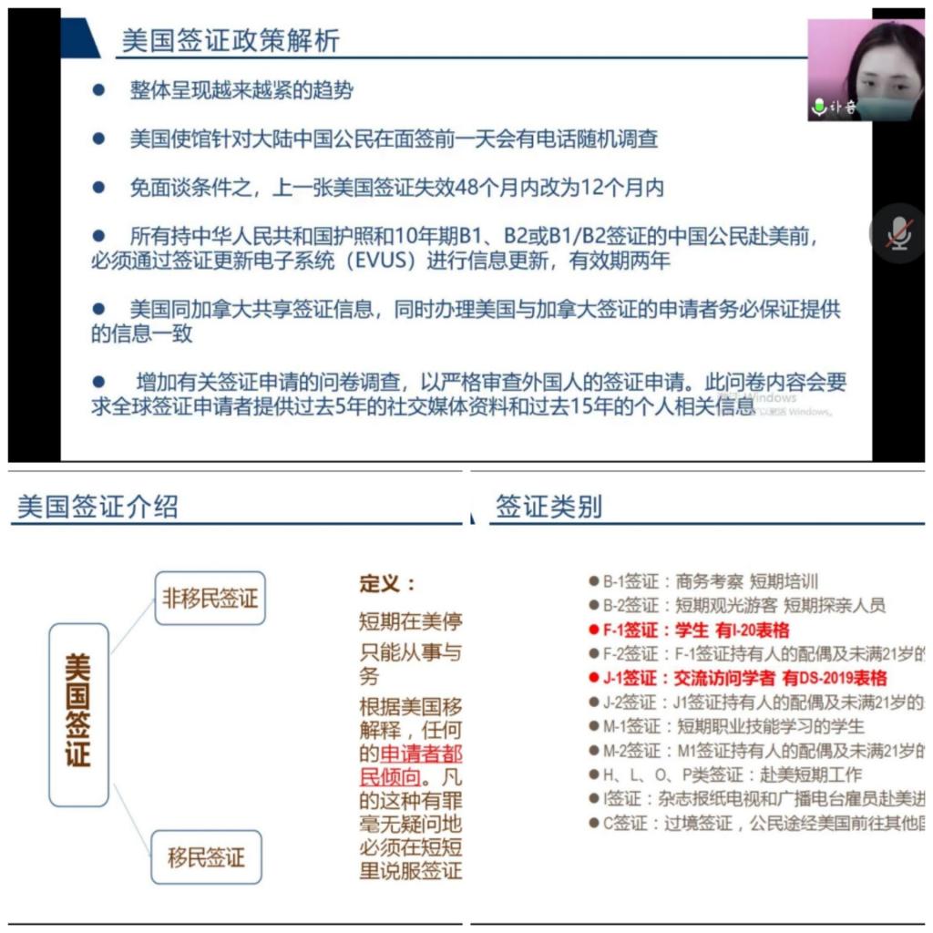 受疫情影响,此次交流会由线下改为线上,大家于云端相聚,交流学习。韦老师首先以美国F1签证为例,介绍了签证政策、具体内容,简单介绍了美国签证类别。其中对F-1签证(学生签证)和J-1签证(交流访问学者签证)进行了特别讲解。这不仅帮助同学们了解到美国签证的基本要求,也让大家知道了签证官在办理签证过程中的重要性。