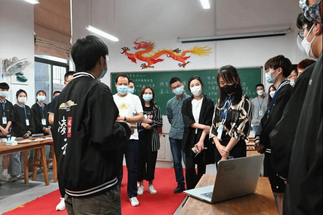 首先,讲解员向评委们介绍了双创先锋班的文化墙。双创先锋班作为学校重点打造的特色班级,承载着培育信息产业企业经营管理骨干和“尖兵”的重任。文化墙主要凸显了双创先锋班的办学特色以及强大的师资力量。也寄望学员们能通过在双创先锋班的学习,未来成为极具影响力的企业家。