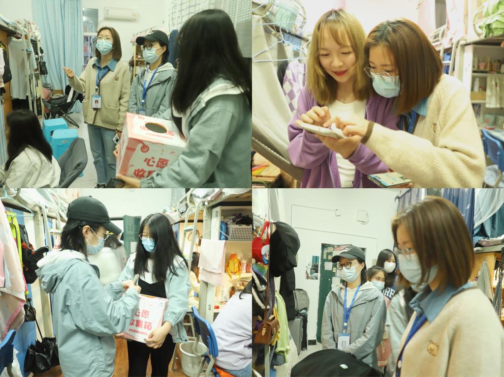 月光轻拂,花果楼前人影攒动,随着花果书院指导老师以及学生代表一行人的步伐,温暖悄然飘进了花果书院寝室楼。“咚!咚!咚!”的敲门声回响在安静的楼道里。“同学们好,我们是花果书院的老师,最近因为疫情学校封闭运行管理,我们想了解大家最近的学习生活状态和需求。大家近期有什么小心愿可以写下来放入心愿收集箱,我们后续也会抽取部分心愿帮助实现。”初次见面,笑语盈盈,花果书院师生通过简单的介绍表明来意,与同学们亲切交流,嘱咐同学们要严格遵守疫情防控期间校园管理要求,做好疫情防控常态化下的自我管理和个人防护。同时建议同学们明确学习目标,抓住这个特殊的时间节点不断沉淀、积累,尽快调整适应封校生活。“有一说一《猎罪图鉴》是真的好看,台词很上头,我还特地充了会员看,一集一集停不下来,好喜欢这种类型题材的剧,老师你们一定要去看哦。”除了疫情和学习,书院老师和同学们无话不谈,从热播剧聊到感情困惑再到健身减肥小诀窍,这次走访把书院的关心与爱护送到同学们的心坎上。从惊讶到惊喜,受访的同学们切身感受到了来自花果书院师生的关怀,让疫情之下的校园生活多了一份温暖。
