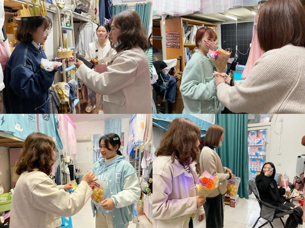伴随着轻快的生日快乐歌声,书院老师端着蛋糕提着礼物推开寝室门,给报名三月师生集体生日会的寿星刘继莲同学送上了生日祝福。“虽然因为疫情导致三月师生集体生日会推迟,但是来自花果书院的祝福不会延期推迟哟,希望你在花果书院能够幸福快乐,努力实现自己的愿望与梦想。生日快乐!祝你永远十八岁,每天开心!”除了个性化的生日温暖趴,书院老师还在心愿箱抽取了部分幸运同学,根据心愿清单为她们送上了奶茶、泡芙、鲜花......为乏味的封校生活加上了花果特制的甜!