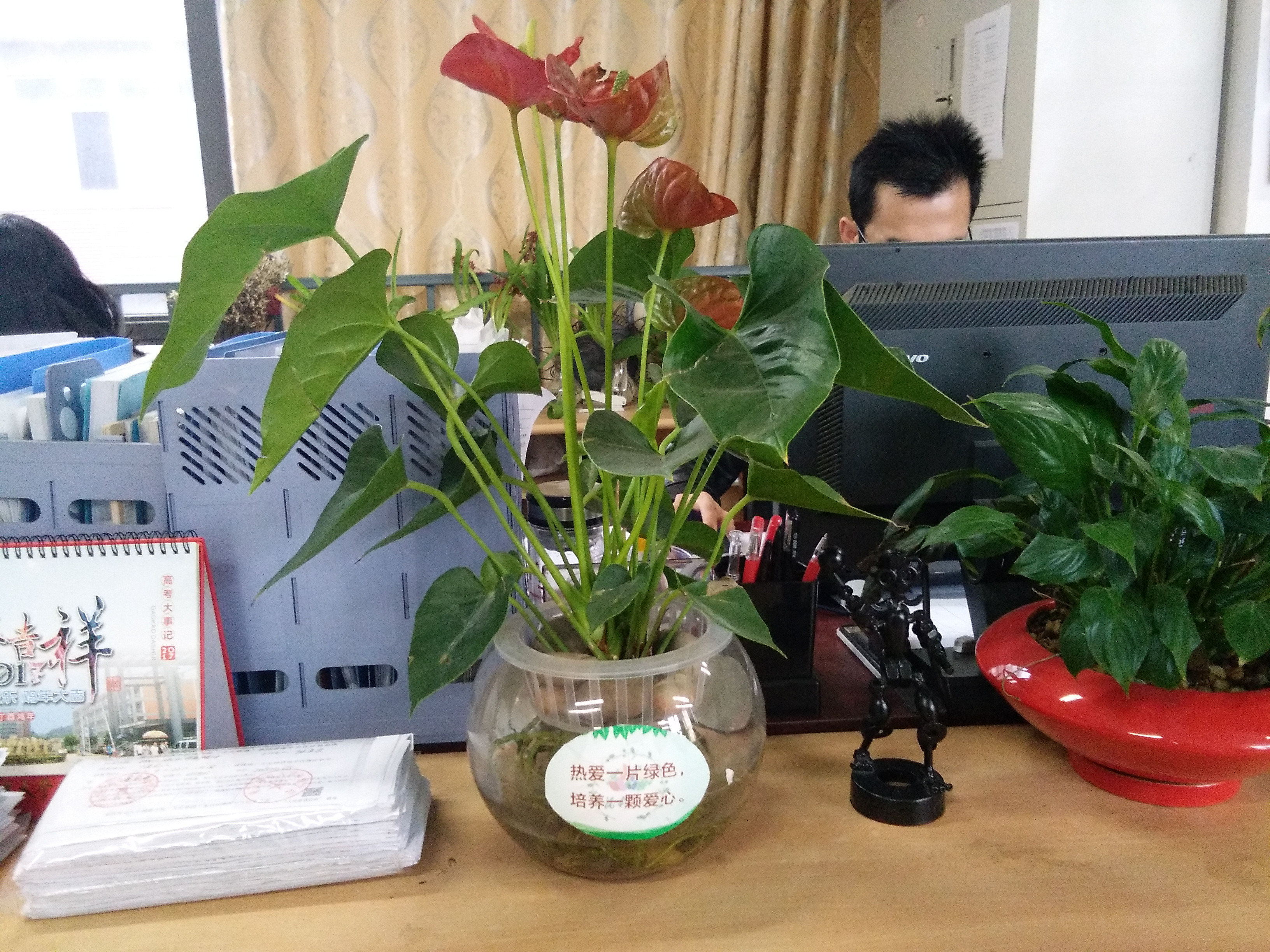 (2016年起,花卉协会在学校公共区域、行政办公室等处放置了60余盆水培植物,图为花卉协会放置在教师办公室的水培植物)