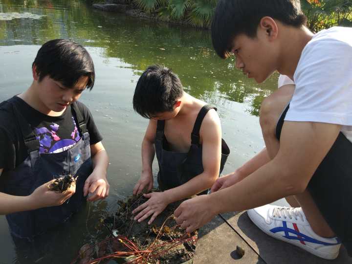 (图为花卉协会的同学们和学校绿化队老师一起在双子湖种植碗莲)