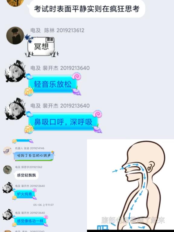杨老师利用图片、视频、案例等多种手段结合,详细介绍了几种简单快速的方法,比如深呼吸、轻音乐、积极暗示、冥想等等。课堂上,杨老师结合自身的经历讲解了深呼吸的作用以及技巧,并通过一段“跟我学腹式呼吸法”的视频,带领学生一起体验了深呼吸。体验结束后,同学们在群里互相谈论,分享自己的感受。腹式呼吸看似简单,却能在一呼一吸间放松身心,让我们的肌肉变松驰,大脑活跃。处于这一状态的大脑提供了意识与潜意识的桥梁,我们所创造的各种信息,此时就可以顺利进入潜意识里。