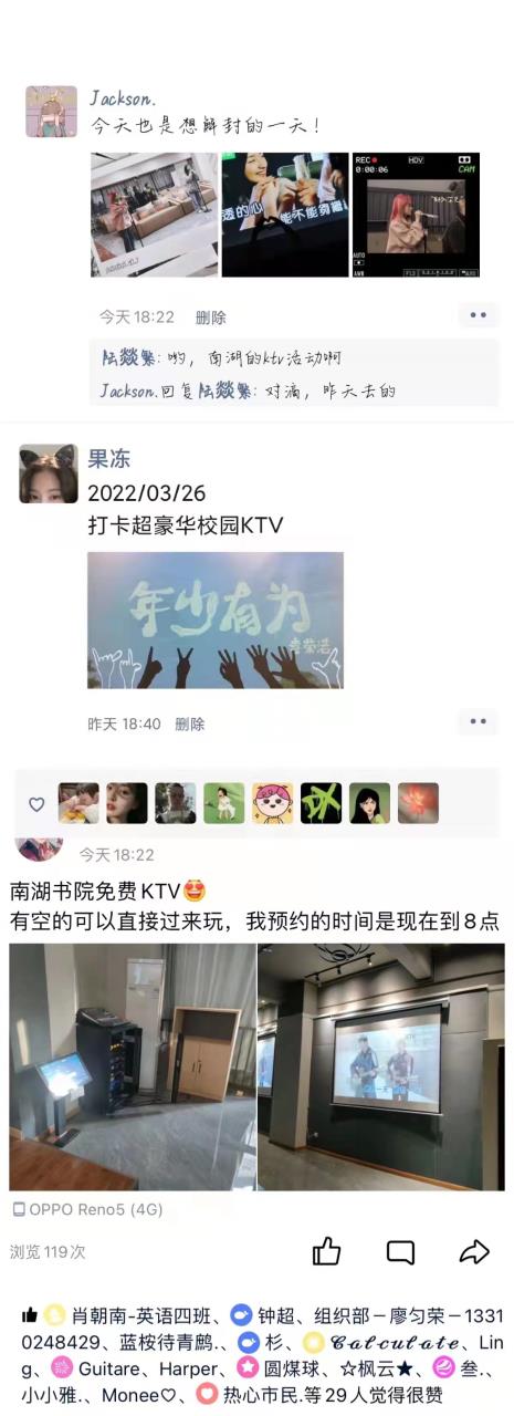 在看到南湖宿舍嗨歌活动后,怀着试一试的心态预约K歌。声影活动室又大又温馨,感受到书院对我们满满的爱!这个活动让我通过歌声认识了好多志同道合爱唱歌的新朋友,我不仅享受了音乐的美好,也把快乐传递给了周围的人。期待这个活动能够继续办下去,让我们在封闭管理期间的校园生活变得多姿多彩。