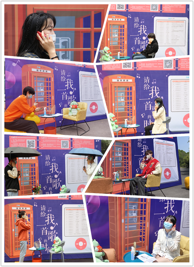 “若有知音见采,不辞遍唱阳春”。伫立在春意盎然的三月里,南湖书院通过线上点歌分享心里故事、与舍友书院K歌以及“电话亭”里给陌生人唱歌等方式,开展“唱享南湖”第二期“请给我一首歌的时间”,倾听同学的情绪和故事,鼓励他们打破沟通壁垒,引导他们及时、正确舒缓心理压力,搭建起书院兴趣圈层,给予学子通过音乐展现风采、增强自信心的展示平台,把青春的欢乐和歌声留在春天。