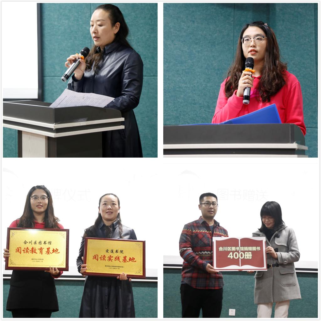 图书馆作为一个储存图书与传播知识的场所,传承着无形的智慧与历史文明,本次校地合作对爱莲书院家文化体系“家传”版块建设起到积极推动作用。仪式开始,爱莲书院综合办公室主任孙佳婧老师为大家介绍爱莲书院概况并宣读合川区图书馆与爱莲书院共建阅读教育基地合作方案。图书馆的入驻不仅能够给书院提供丰富的阅读教育平台,更能通过系列“家风家教”讲座、阅读实践活动等贯彻落实社会主义核心价值观,也是书院搭建“四全育人体系”连接点平台的生动体现。接下来,由合川区图书馆馆长刘格老师和爱莲书院综合办公室主任孙佳婧老师进行交换授牌,爱莲书院为合川区图书馆“阅读教育基地”,合川区图书馆为爱莲书院“阅读实践基地”。
