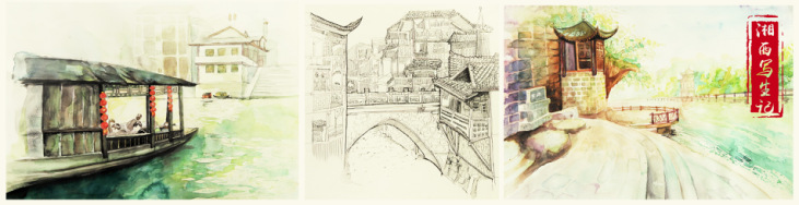 本次写生创作形式多种多样,黎老师鼓励同学们尝试结合水彩、水粉、油画、彩铅、马克笔、蜡染等多种材料进行艺术创作,摒弃固有绘画模式,转变创意思路。杨杰老师则强调绘画的步骤与层次,加强透视方面的训练。大家创作的热情高涨,兴趣浓厚。日出而作,日落而息,同学们散布在边城各个角落作画,与美景和谐共融。