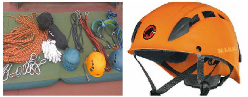 缓冲头盔:供高空挑战者保护头部使用,不同于车用头盔的一种安全头盔,破碎式的,有缓冲减震功能。